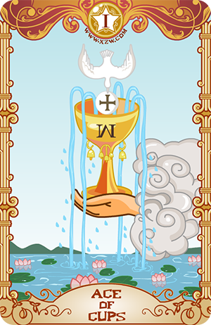 王牌不只意味一个情感满足的时间,也是持续你心灵发展的一个机会……透过爱,这个最令人振奋、有用的方式。牌中的手从云(心灵)中伸出,握着一个圣杯,水自其中溢出,流进了一方池塘这象征情感满足的来源是心灵,而且当你与心灵越加投契时,你就能享受更多的爱以及比你所与其更丰盛的感情。当心灵在我们生活的许多瞬间契合了,即使是一些小小的事情也能让你充满喜悦,像是一个阳光灿烂的日子、一朵孤零的小花、一抹婴儿的微笑,或是看见一只小昆虫在卷曲的叶子当中建造家园。而当你失去这种契合时,你会在挑战中寻求满足。