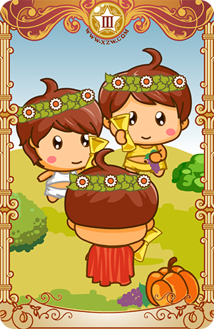 圣杯三意指欢乐、分享或庆贺。这张牌通常会出现在圣诞节之前的几个星期中,因为大多数人即将举行祝贺。这张牌上所画的三个女人正在庆祝丰收,他们辛勤的成果就展示在他们的脚边。这是一张意味通过障碍的胜利,或者工作产生成果的牌。