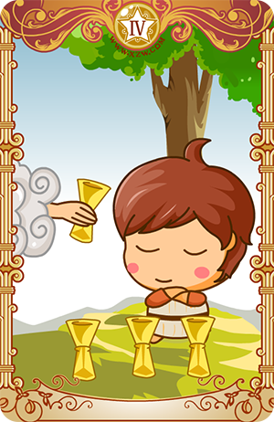 圣杯四可能说是一张代表冷漠无情或不满足的牌。牌上所画的这个人无法从三个杯子中得到满足,或无法满足于他眼前的机会,不过只要他准备好向自己的内心寻找,他还是有很多可得到满足的机会的。这张牌告诉我们,你必须将自己和心灵的目的的结合起来,如此才能确实掌握住满足的泉源。