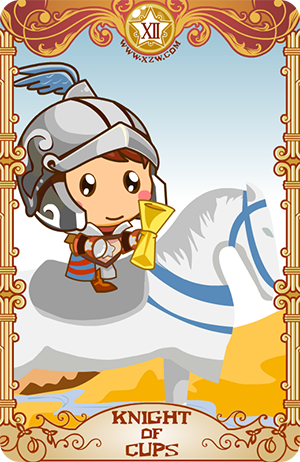 圣杯骑士暗示来自某人的供给。例如,生意上的提供或机会的提供。有一个二十来岁的人,或年纪更长但感情年龄只有二十几岁的人,要献给你某种东西。它可能是指情感上的奉献,或某种更为实际的事物。
