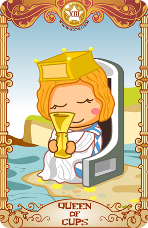 这张皇后牌代表占星学中水的符号,包括巨蟹座、天歇座和双鱼座。手中的杯子是她自己创造出来的,而且比这组牌的其他杯子更华丽。在她的杯子里,她可清楚的看见她想要什么,以及她该怎么做才可以得到它。杯子给了她有关将来或各种可能性的一份憧憬,而这些别人却不见的看得出来。她对周遭事物和本身有着超凡的敏锐度,并足以展现出强烈的精神力量。由于本性消极(也就是说,喜欢感觉胜于行动),所以皇后在某些不可预料的事物发生后,通常会说:“噢,我上个星期才梦见那件事情。”