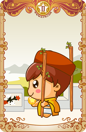 在权杖二上,一支权杖是拴在墙上,而另外一只是自由的。这表示你有两个选择,一部分的你满意静止状态,而另一部分的你有移动、改变或旅行的欲望。而权杖二里的人是烦闷的,被他的成就(矮墙)所围绕。他手中的地球仪表示他正在做一决定。他的世界(指他的成就或环境)对他而言,似乎不再具有意义了,因为他已经长大而不适宜于此了。土地表示稳定力,水表示宁静。他越过水,眺望远山及其代表的挑战,天空乌云密布,但他并没有注意到,因为他将焦点置于内心世界。