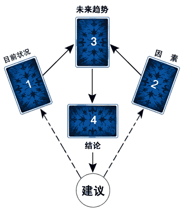 按照牌摆放的顺序进行。先解释当事人现在的状况,再解释与对方关系过去的缘起,然后解释双方关系的未来发展趋势,最后解释第四张牌。全部解释后,综合所有信息对问卜者提出建议。