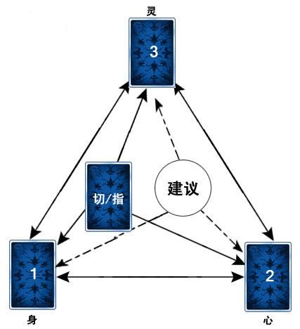 身心灵牌阵的布局采用的是三角形布局。第一张牌代表着身体状况或事情对身体状况的影响;第二张牌代表着心理状况或事件对心理的影响;第三张牌被称为灵,表示的是精神状态或事件对精神上的影响。