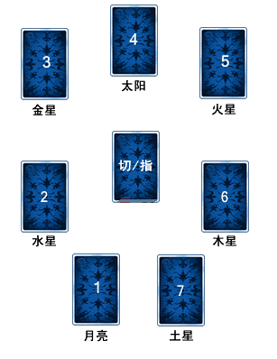七行星牌阵中的七张牌等距离地环为一圈。第一张牌是月亮,代表家族因素或安全感;第二张牌是水星,代表商业贸易,也表示与他人的交流和互动;第三张牌是金星,表示财务及人际关系,也代表人的感情生活;第四张牌是太阳,代表着地位和荣耀,并与个人的自我表现有关;第五张牌是火星,表示问题和冲突,还与个人的行动能力有关;第六张牌是木星,代表机会和幸运,并与个人的长远目标有关;第七张牌是土星,代表着责任和限制,也和人的疾病有关。