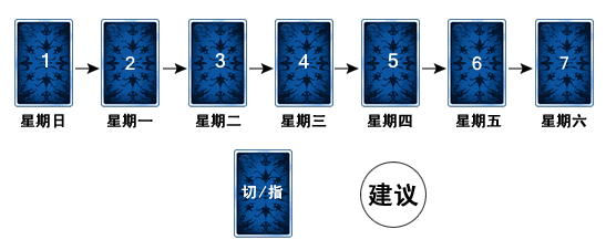 每周预测牌阵需要用七张牌来反映问卜者某一事情的一周态势。七张牌由左至右平行排列,左手第一张代表星期天,然后按时间顺序由左至右一张牌分别代表一天。