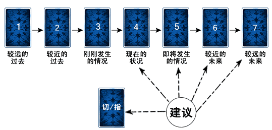 在这里,代表不同时段的七张牌表示客观状况,切牌则显示的是问卜者问卜时的心态。如果使用指示牌,表示的是当事人的特质。