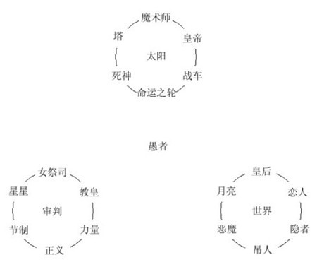 理解意识之环的另一条途径就是将同一阶层的三张牌进行联系比对,如:第一组由魔术师、女祭司和皇后组成,