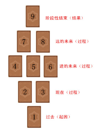 这个牌阵,是比较简单的时间流,一共9张牌,名字叫做:九叶(Nine-LeavesSpread),适合中高级学员练习综合性解牌。
