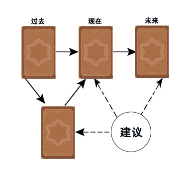 第一张牌代表过去,表示已经发生过的事情;第二张牌描述的是当前的情况,也是一种纯客观的反映;第三张牌表示如果放任事情发展,不发生任何作为,事情将会出现什么结果,是一种地未知的判断。过去、现在、未来由左至右平行排列,切牌或指示牌位于三张牌的下方。切牌表示问卜者当时的心态,是一种主观反映。指示牌则代表了当事人的基本特质。