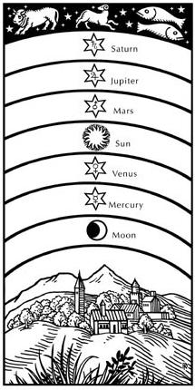 每一颗行星都在各自的球体轨道上运行,它们自下而上构成连接地球与天国的“阶梯”。而灵魂进入宇宙沿着七重阶梯下降到地球,在地球上“披上”肉体,这便注定了要顺从于命运与死亡。