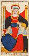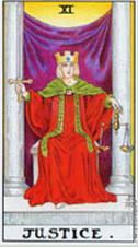 首先要注意的是,伟特塔罗的正义其编号为11,而不是马赛塔罗中的8(至于正义和力量的位置讨论将会在解说力量牌的时候探讨)。正义被置于11基本上是为了与占星中的天平座对应,而原本马赛11号力量被换到8,与狮子座对应。伟特牌中正义的图像又是一个人坐于双柱之间,并且还和女祭司类似的是,正义人物身后的双柱之间亦有一帘布幔,对于此,伟特指出正义布幔后的东西和女祭司布幔后的东西是不同的,正义布幔后的是一片金黄发亮的曙光。人物头上的头冠中间有一个四方形符号,另外她胸前也有内圆外方符号的扣子。她左手持着天平,代表公正的判断;她的右手持着剑尖朝上的宝剑,代表责任与宽恕。正义是美德的堡垒,代表义理、真实、公正和正确的判断和决策、以及一些与法律有关的事务。(完)