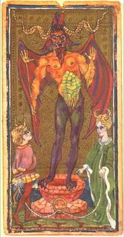 恶魔的手势似乎是对教皇祝福姿势的嘲弄,他蹲于一根狭长的黑柱上,身前立着一男一女,两人被链条所铐牢。一男一女分别可联系到亚当和夏娃,但他们的爱与光明的天使却变成了自私与黑暗的堕落恶魔。他们的裸体代表了原始欲望的放纵,从形象上看他们也被赋予了动物的兽性特征——尾巴与角,这是亚当与夏娃堕落的情形。这张牌代表的是关押、束缚、限制、沉溺、上瘾、自私、邪恶、丑陋与道德败坏。(完)