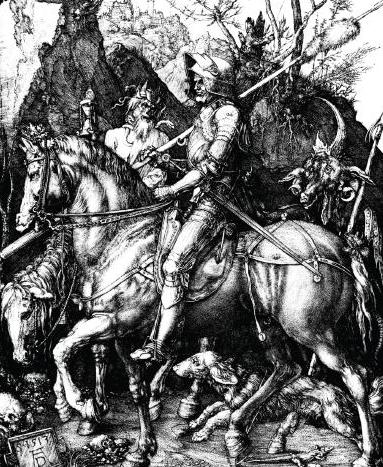 上图是著名的文艺复兴时期德国的艺术家阿尔布雷特·丢勒(AlbrechtDürer1417-1528)于1513年创造过一副与恶魔主题相同的雕刻艺术,名曰“骑士、死亡与恶魔”。丢勒在艺术作品中非常注重寓意和象征。在他作品里,每一个细节符号与图像都传达出深远的意义。“骑士、死亡与恶魔”表达的骑士精神和英雄历险与塔罗的故事类似。图的中央是一位骑士,他坐在自己的马上,给人一种坚定的感觉。在他的马前有一个骷髅头,代表死亡。