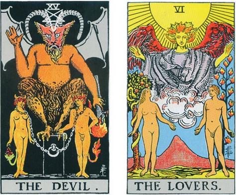 恶魔与恋人是非常有意思的两张牌的组合。其实他们之间非常相似,同时又非常不同。恶魔与恋人就像是两面镜子在反射着同一个景象,从画面的规划到主要组成的元素再到细节都很相像。它们是名符其实的一个银币的两面图案。两张牌大致上都是由三角形组成,中上部分一个天使和底下分别站在左右的两个裸体男女人物。从局部看,左右边的男女象征着阴阳的两元性能量。不过,从整个图面的来分析,上下部分的神明与人类也可以看成是两元能量的象征。另外一种分析是把三角形看成是意识(男人,身)、潜意识(女人,心)和超意识(天使/恶魔,集体潜意识,灵)的对照。这里面的离合关系才是两张牌的关键点。