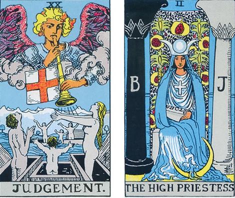 在“审判”与“女教皇”这一对牌之间存在着非常多的不同点。让我们先专注于牌面上的人物,在“审判”牌面的下方位置站立着六位裸体的人物,牌面的上方有一个腾云驾雾的天使吹着乐器。多位人物的出现让我们以多种不同角度和观点去看待这张牌,站立着的肢体语言比坐着更有动力与行动力。至于多位裸体的人物也象征着“审判”一牌中那剥夺一切重新开始的概念,这也让我们想起“死后不能带走任何东西”的古老说法。相比之下,“女教皇”一人宁静安详地坐在牌面中间就形成了强烈的对比。她的盛装出场好像在提醒我们“女教皇”本身就是完整的,充分的装备齐全。她不需要天使的呼唤才能重新开始或者得到任何的提升,因为“女教皇”就是永恒的完整,完美的状态。而且她的视野虽然是单一的,可是也是唯一的、古老的,她是通过懂得奥秘中的智慧去看待世界万物的。