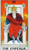 在金色曙光系统中,皇帝对应白羊座,公羊的标志,我们可以发现在皇帝的座椅四角雕有四个羊头,另外在皇帝本人的肩膀上亦有一个。在皇帝的衣袍下是铠甲,其这身服饰是火星的符号,火星支配着白羊座。皇帝坐于冰冷的石座,四周是冷峻、贫瘠的山石,与皇后形成互补之势。皇后代表放纵,皇帝则代表收敛;皇后代表享受,皇帝则代表自律。在炼金学中,皇帝为红色的国王,而皇后为白色的女王。握在皇帝手中的手杖是他权职的象征,由阴性的权球和阳性的权杖组成,另外权杖部分有一个T形十字符号,这是象征生命的标志。所以整个手杖的符号呈现出的是TARO的首字母和尾字母。这张牌代表来自于自制与自律的权力、权威、力量和能力,同时也可代表某位权威人士。(完)