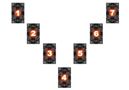 2. 切实牌后,将最上面的第一张到第七张取出,依图示的位置放好。但要小心,不要把牌的上下方向弄颠倒。