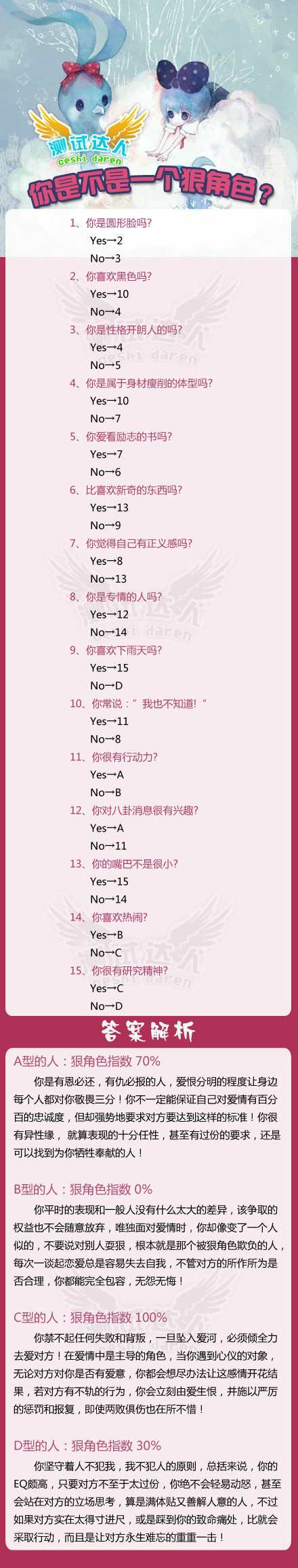 【导语】一部电影或者电视剧,里面的角色设定必定会有那么一两个狠角色,或者男猪脚女猪脚就是那个狠角色。生活中也难免会有狠角色,那么你是不是一个狠角色呢?马上让星座屋小编带你来测测看吧!